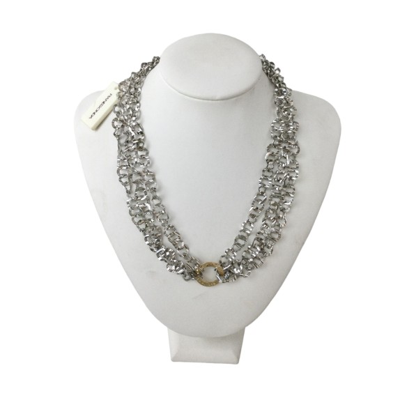 Collana a 3 fili di maglie modello catena con inserto centrale in oro 18Kt e chiusura a moschettone con logo dell'azienda inciso